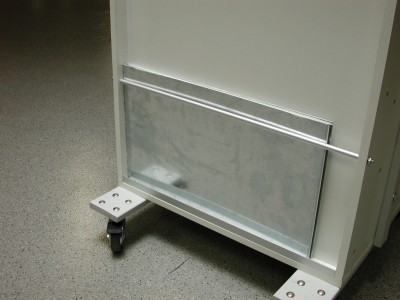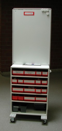Als universell einsetzbares Stativsystem hat sich ein fahrbarer Experimentierstand bewährt. An ihm können Lehrerdemonstrationen durchgeführt werden, die mit einen Videokamera auf ein Fernsehgerät oder einen Beamer übertragen werden können. Zudem ist es möglich, Versuchsaufbauten zusammenzustellen, die die Schüler dann leicht nachbauen können. Kernstück des fahrbaren Experimentierstandes ist ein Untergestell zur Aufnahme von Sortierkästen zur Aufbewahrung von Spritzen etc. . Darüber befindet sich eine Pinwand (600 x 900 mm) aus emailliertem Stahl. An ihr lassen sich mit Hilfe von Magnetklemmen die Versuchsaufbauten leicht befestigen und jederzeit leicht verändern. Beschriftet werden Versuchsanordnungen mit abwischbaren Spezialfilzschreibern. Auf der Rückseite sind kleinere Sortierkästen angebracht, die Kleinteile wie Dreiwegehähne, Silikonverbinder oder Adapter enthalten. Zudem ist im oberen Bereich ein Stahlblech aufgeschraubt, an das die Magnetklemmen geheftet werden. Von jeder Größe sind 8 Stück vorhanden, um für eine entsprechende Arbeitsgruppenzahl alle Geräte zur Hand zu haben. Ebenso findet man hier 8 Stahlplatten, die in die Holzstative der Schülerübungsplätze geschoben werden können. Der Nachbau gestaltet sich recht einfach. Auf eine genaue Maßangabe wird verzichtet, da ein solcher Experimentierstand individuell zusammengestellt werden sollte. Der hier abgebildete Stand hat eine Höhe von ca. 1700 mm , eine Breite von ca. 600 mm und eine Tiefe von ca. 450 mm.