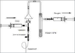 Problematisch ist im Unterricht die Darstellung von HCl(g) oder besser noch HBr(g)aus den Elementen. Üblicherweise wird dabei Wasserstoff in einer Chlor- bzw. Bromatmosphäre verbrannt. Man kann aus den Spritzetechnikgeräten allerdings einen Daniellschen Hahn konstruieren, mit dem die beiden Gase einfach zur Reaktion gebracht werden können. Man benötigt zu diesem Zweck ein T-Stück aus 8mm Glas, dessen Schenkel man passend kürzt. Auf den rechten und unteren Schenkel klebt man aufgebohrte Blindstopfen als Adapter für die Luer-Verbindungen auf. Das untere Ende verschließt man mit einem Injektstopfen, durch den man eine Kanüle steckt, die so weit nach oben geschoben wird, bis die Spitze so eben aus der Öffnung des T-Stücks herausragt. Das Brenngas wird von unten über einen Dreiwegehahn, dessen einer „Weg“ mit einem Blindstopfen verschlossen ist, eingeleitet. Das entstehende Chlorwasserstoffgas saugt man mit Hilfe einer Spritze durch eine Bromthymolblaulösung, die man zuvor mit etwas Natriumcarbonat alkalisch eingestellt hat.