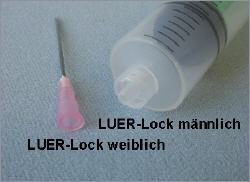 Medizintechnische Geräte werden weitestgehend über so genannte Luer bzw. Luer-Lock-Verbindungen miteinander verbunden. Sinnigerweise verwendet man die in der Technik üblichen Bezeichnungen „männlich – weiblich“ oder „male – female“ oder „m – f“. Während die einfache Luer-Verbindung mit einem Normschliffstopfen (m) und einer Normschliffhülse (f) im Miniformat vergleichbar ist, verfügt der Luer-Lock Anschluss zusätzlich über eine Arretierungsmöglichkeit. Dabei wird durch eine leichte Drehung die Verbindung fixiert und auch entsprechend gelöst. Kanülen lassen sich so sicher an einer Spritze befestigen, ohne dass sie bei leichten mechanischen Beanspruchungen herausrutschen. Luer-Lock Verbindungen sind somit gegen versehentliches Lösen sehr sicher. Immer dann, wenn Apparaturen mechanisch stark beansprucht werden (z.B. Luftanalyse) ist diese Art der Arretierung angesagt.